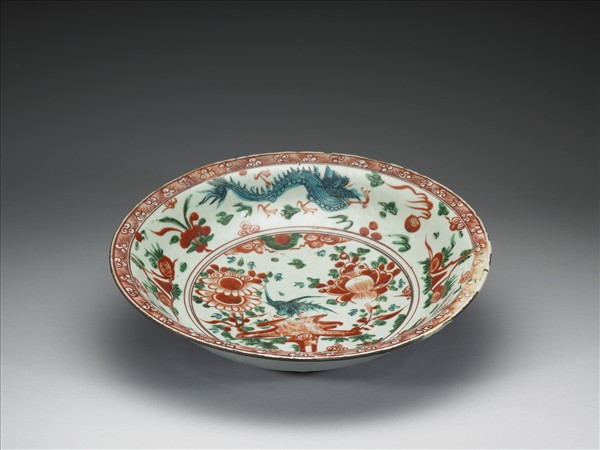 盤,圓形,侈口,圈足。碗內壁飾以紅、綠、土耳其青三色組成的龍鳳及花卉紋。此器產自福建漳州窯,漳州五彩瓷在十七世紀時曾大量外銷。