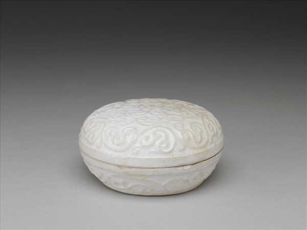 蒸餅式圓盒,子母口相合,餅形足底部向內斜凹入。盒蓋面及盒壁皆印花陽文卷草為飾,卷草鬚捲迎讓纏繞成幾何式圖案。胎白而鬆,透明釉汁成白瓷效果,積釉處微青;器裡僅施半釉,口緣及底均無釉。福建盛產青白瓷及近似白瓷的器皿以外銷,如閩南的安溪、德化,因產瓷土而窯業興盛,所造紋飾工謹,且均有專製盒子的工作坊;瓷盒有大小多種形式,紋飾多為陽文卷枝紋。這種在器面上以曲繞的線條組成卷草紋或如意雲頭紋,是宋、元的金銀器、漆器、瓷器上都很常見的裝飾習慣。