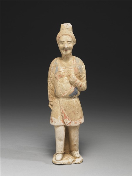 胡人陶俑立像,高鼻,紅唇,突顴骨,墨繪八字鬍,微笑神情。立俑五官特徵明顯,頭戴折沿氈帽,著寬袍,束腰,袒胸露腹,下著窄褲。體態微後傾,右手貼身側,左手彎曲置胸前。雙足外開與肩齊,駐立器座上。粉砂胎上鉛白釉,釉上鐵紅、鈷藍彩繪多脫落。胡人俑與唐太宗的輔國大將軍張士貴(586-657)墓出土的陶俑類似,為唐顯慶二年(657)之後的作品。
