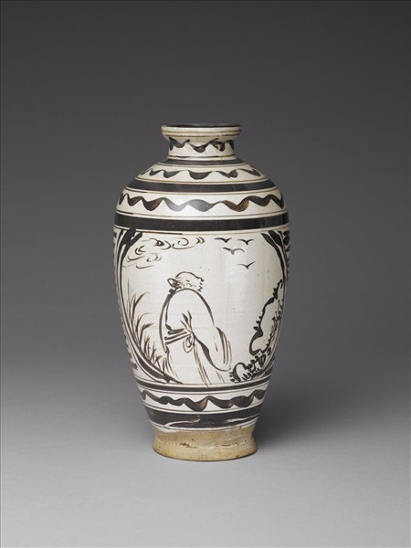 直口短頸,斜肩,瓶身上豐下斂,圈足無釉。釉下黑彩紋飾,口間及腹底飾以弦紋及波浪紋,器身兩面開光飾以人物。一人物站於樹下,前方有嶙峋怪石。另一人物仰首眺望遠方飛鳥。