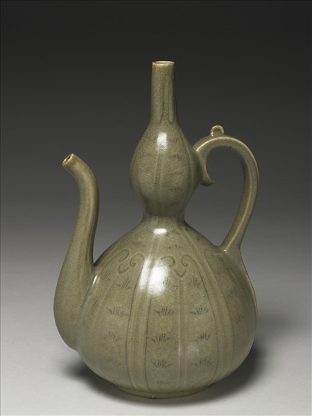 器呈葫蘆形、直口長頸下接橢圓型葫蘆頭。下腹扁碩設一長流及弓形把。整器坐於矮圈足上。通體施綠中帶灰青瓷釉,足底施釉留五支釘痕,器表填泥圓形花葉紋,邊線及葉紋。