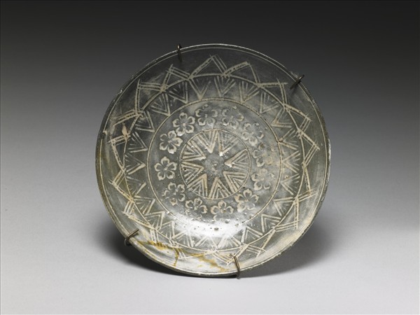 盤為淺壁,小圈足,全器通體施深灰釉,足邊及盤心紋飾均陰刻紋飾,以三角形紋及桃花構成,凹槽間填白泥。