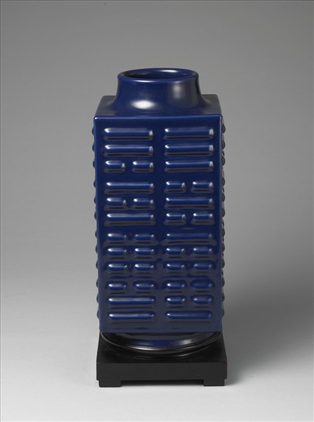 器作內圓外方之琮形,帶直口,圈足,施霽青色釉,圈足露胎,足內施白釉。四面均飾以八卦陽紋。器底書藍色雙行直向款「大清光緒年製」。附一深棕色方形木座,底帶四足。
