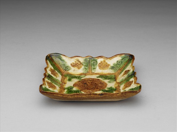 方碟,花形敞口,斜壁,平底。器施白、黃、綠三彩釉,底露胎無釉。器內底心及均分成八格的內壁,各印牡丹花葉,四角加飾綠葉一片。
