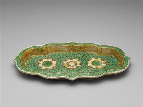 長盤,花形口寬唇,淺壁,平底。器施綠、褐、白三彩,底露胎無釉。唇壁印卷草紋,內底印三朵花,以葉紋為錦地。