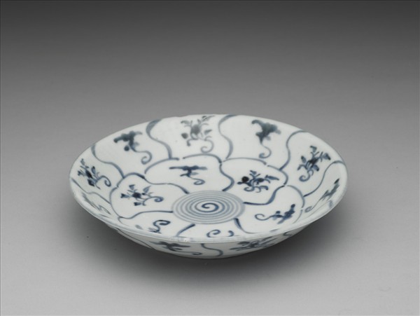 盤,敞口,弧壁,平底,圈足。白地青花釉,器內底心繪渦旋紋,內外壁繪花瓣式格紋,格內畫靈芝紋。器外底雙圈內繪花押。為泰興號出水作品。