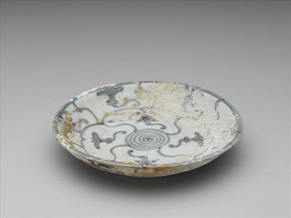 盤,敞口,弧壁,平底,圈足。白地青花釉,器內底心繪渦旋紋,內外壁繪花瓣式格紋,格內畫靈芝紋。器外底雙圈內繪花押。為泰興號出水作品。