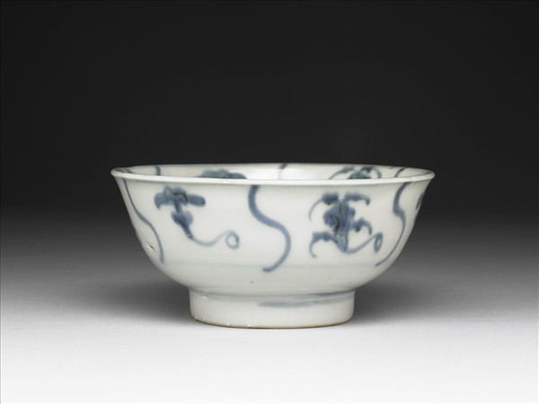 碗,敞口,口緣外彎,圓弧腹,圈足。胎骨白色微泛黃色。內壁青花繪兩層大花瓣,碗心飾一漩渦紋,花瓣內飾有靈芝、花卉;外壁亦繪飾靈芝與花卉。青花色呈灰藍。底外有「獸」字。此器產自福建德化窯,該窯當時生產大量的外銷瓷。為泰興號出水作品。