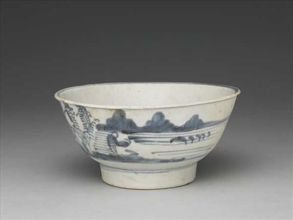 碗,敞口,圓唇,弧壁,平底,圈足。白地青花釉,口沿內外和器外底繪弦紋,器外壁繪山水圖,器內底心繪一圖案紋。器外底心雙圈內青花書「碧玉」兩字。為泰興號出水作品。