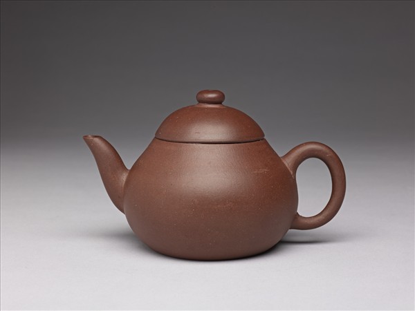 紫砂泥胎,梨形壺,圓蓋鈕,斜直流,弓形把,鈕頂設通氣孔,平底凹足。紫砂泥質較細,帶黑、黃砂點,器底印飾方形與類似蕉葉圖案的花押款。全器胎體略厚,作工粗糙,流、把接連處並未仔細修飾。據捐贈者告知,此壺來自迪沙如(Desaru)號沈船出水,這艘載有近千件宜興茶壺的木製商船,為十九世紀四十年代道光年間航行於中國與南洋間,承載陶瓷貨物外銷東南亞,1845年左右沉沒於馬來西亞。載貨多為一般生活用品,有逾五萬件以上的青花碗、盤、碟、湯匙,以及來自景德鎮、德化窯的陶瓷缸甕等。宜興壺則多具江南紫砂壺及閩粵工夫茶器特徵,典型的梨形壺及直嘴扁腹壺最多,而另艘泰興號沈船亦有相同造型茶壺出水。