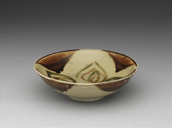 長沙窯也是唐朝時流通在西亞市場上的外銷瓷之一,窯址位於湖南銅官鎮的瓦渣坪,以生產青釉釉下彩繪瓷器聞名。這件淺碗出土於黑石號沈船,採用沾釉方式在口沿內外裝飾出對稱的四個半圓形褐斑,中心畫出簡單率意的四角花圖案。由於同船伴出一件陰刻「寶曆二年七月十六日」紀年銘的同形器,故知這件碗應產燒於九世紀前半葉左右。