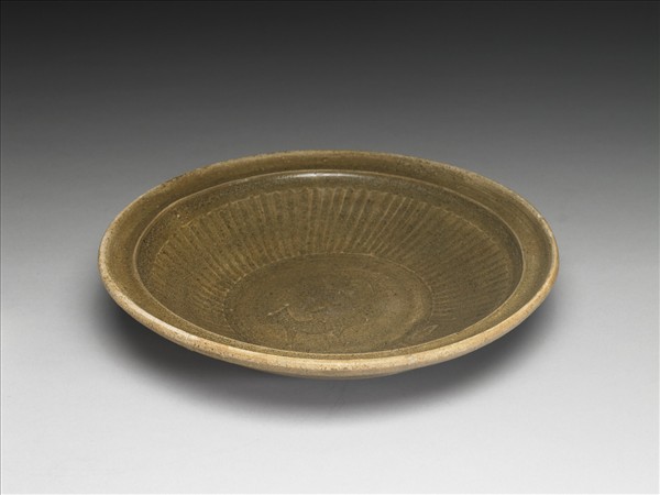 折沿盤,敞口,斜折沿,沿邊唇稜折立。弧形壁,圈足外牆斜收,內牆直而淺。器內壁刻密接的直線狀菊瓣裝飾,內底押印凹下的雙魚紋,印紋淺而魚形生硬。但盤形與裝飾明顯襲仿龍泉窯作品。釉色為深沈的褐綠色,底無釉;胎色灰黃粗鬆。此器形紋飾常見於泰國北部Sankampaeng窯的作品。