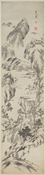 朱耷(一六二六—一七○五),明宗室,甲申後為僧,號八大山人,又號雪個、人屋,江西人。能詩工書,擅山水、花鳥、竹石,筆情縱恣。不泥成法。所題「八大山人」四字,多聯綴成似哭之或笑之,蓋別有用意。與弘仁、石谿、石濤俗稱「四僧」。 此畫在構圖上承緒了董其昌「三四大開合」的理念;由於畫幅狹長,故偏重上下氣勢的連貫運行,以龍脈統理畫面,而省略了細節的描繪,故實景雖多,仍顯露出灑脫縱恣的空靈效果。