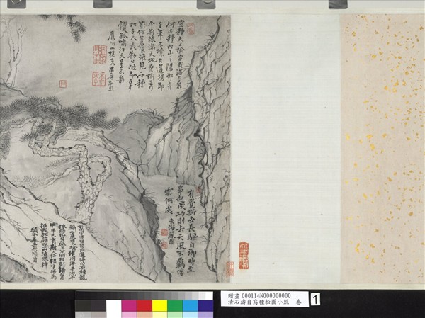 石濤(西元一六四二-一七○八年)本名朱若極,明朝皇室後代。明亡之後出家為僧,遊歷於安徽宣城,後又遷居金陵、揚州等地。他善於畫山水、花果、蘭竹,人物畫較少見。筆意狂縱恣肆,用墨淋漓多變。提倡我自用我法,風格獨創。本畫作於一六七四年。畫松竹林野之間,手執鋤頭的青年石濤坐在松前,意態悠閒。乾渴的筆墨與清晰的線條性在畫家早年風格中常見。本幅為羅家倫先生捐贈。