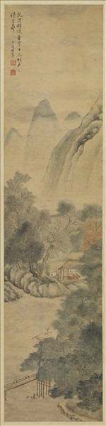 張崟(西元一七六一-一八二九年)。丹徒人。字寶巖。號夕庵。又號且翁。工篆隸行草。善畫畫。好作詩。著有逃禪閣詩集。 這幅畫用乾筆皴擦。煙嵐瀰漫的遠山,墨暈淡淡的。近山處,一雅士在松下聽泉,讓人進入忘我的境界。