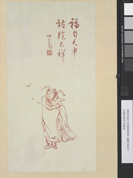 溥儒(西元一八九六-一九六三年),河北宛平(今北平市)人。字心畬,別署西山逸士。清宗室,恭親王奕訢之孫。幼即究心文學、書法、繪畫。其畫作係出自學,風格清逸出塵,時人譽為民國畫家中,最能得傳統之精髓者。   本幅選自寒玉堂託管之文物。硃砂鍾馗像,於清代即見記載。《燕京歲時記》有謂:「每至端陽,市肆間用尺幅黃紙蓋以硃印,或繪畫天師鍾馗。」溥氏此此作雖係端節應景,然筆線轉折勁利,與民俗圖像,自不可同日而語。