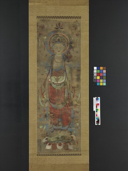 這件畫軸是張大千先生大風堂遺贈。畫中的觀世音菩薩頭戴華麗寶冠,手捧蓮台寶珠,站在一座蓮台上。畫上寫著:「仁壽三年(六0三)癸亥十一月,清信弟子成陀羅為亡女阿嬃敬造。」在敦煌隋代石窟裡也發現了成陁羅的名字,這樣看來,它似乎應是一幅隋代的畫作。可是畫中人物的身體比例和隋代的敦煌壁畫不同,而觀音五官與手腳等部分的暈染技巧也過於成熟,所以它可能出自後人的手筆。