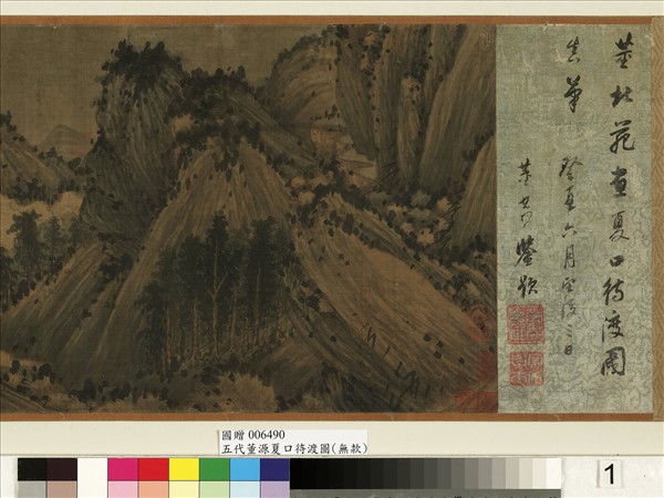 董源(活動於西元十世紀上半葉),字叔達,江南鍾陵人。事南唐為北苑副使。善畫山水,兼工畫牛、虎、龍、水。山水多寫江南真山,不為奇崎之筆。米芾稱述董源畫法,謂為峰巒出沒,雲霧顯晦,不裝巧趣,皆得天真。 本幅舊題為董源,畫夏日溪山縈帶,林屋映蔽,白雲浮現於山腰,江面潦闊,岸邊眾桅高聳。畫山峰以長披麻皴為主,表現鬆軟土質山巒,林木均是重墨漬染,苔點亦繁盛,意在表現夏日草木蓊鬱,萬物蓬勃生長。 本卷係張大千先生遺贈。