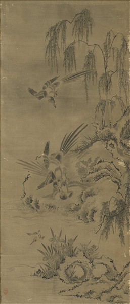 無款花鳥屏風六幅 單片 柳陰喜鵲