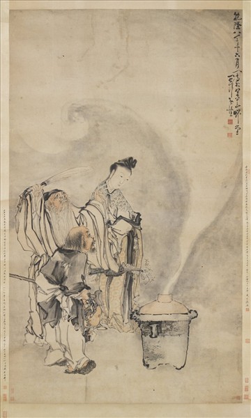 黃慎(西元一六八七-一七六八年後),福建寧化人,字躬懋、恭懋、恭壽。號癭瓢。幼貧,遂放棄科學,從上官周學畫,後赴楊州鬻畫,為揚州畫派之佼佼者。 煉丹圖繪何仙姑、李鐵拐與張果老三仙圍爐煉丹,爐煙裊裊,虛實相映間,倍覺氣勢逼人。鑑於畫幅碩大。作者行筆賦彩之際,便益發潑辣大膽。人物衣紋暨頭部髮鬚,俱盤曲飛動,極富輕重、疏密、粗細等變化,時而凝重如古篆,時而又糾結似狂草,誠屬書法入畫而有卓越成就者。