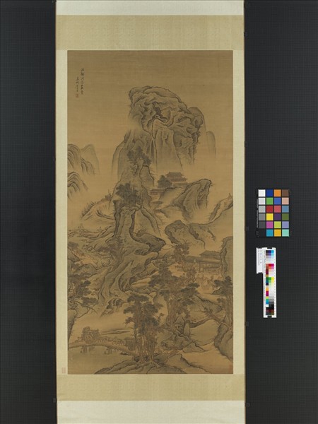 李寅是十八世紀初,活動於江蘇揚州的山水畫家。這幅畫依其題識,取材於北宋郭熙的畫意。郭熙的畫中常見長松巨木,溪壑深谷,峰巒聳峻和煙雲變滅的景色,這幅畫也有這些特色,不過李寅將郭熙的畫法變成固定的模式,山石捲動扭曲,岩石表面凹凸不平,形狀十分奇特。其間點綴牛車,驛站和趕路的行人,使畫面顯得熱鬧生動。 本幅為黃君璧先生捐贈。