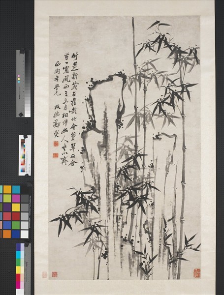 鄭燮(西元一六九三-一七六五年),江蘇興化人。字克柔,號板橋。工詩文,善書畫,是清代中葉揚州畫派的重要畫家。竹石是鄭板橋最喜愛的繪畫題材。這幅畫中的石塊造型瘦硬,竹竿挺拔,竹葉蕭疏,充分表現了竹子孤高不屈的性格。全作用筆蒼勁有力,用墨酣暢淋漓。畫幅左側鄭氏款識的字體剞側,隨意揮灑,正是他得意的「六分半書」。全作書畫結合,天趣盎然。本幅為黃君璧先生捐贈。