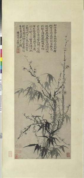 石濤(西元一六四二-一七0七年),廣西桂林人。本名朱若極,號大滌子等,為明代楚藩後裔。明亡後為僧,法號元濟、道濟,遊歷安徽宣城,隱居金陵、揚州等地。 這幅梅竹為林宗毅先生所捐贈,極具水墨氤氳的效果,有被雨洗過的感覺。畫梅花沒有繁枝密卉,而以鈍筆潤墨、簡單的筆畫,表現梅花的清雅高潔;畫竹則以濃淡分明的墨色,畫出竹的前後層次。
