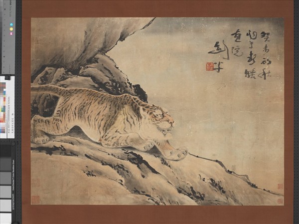 高劍父(西元一八七九-一九五一年),原名崙,字鵲庭,後改劍父,廣東番禺人。早年師事居廉(一八二八-一○四),曾留學日本,歸國後銳意革新,為嶺南派創始人。   高氏作畫,兼善山水、花鳥、走獸、人物。本幅為林宗毅先生捐贈,畫猛虎出山,於墨彩染暈之際,已突破傳統格局,特重立體及氣氛掌握,饒有日本畫風的特質。款云:癸未初秋作于春睡畫院,劍父。鈐印:高崙之鈢。
