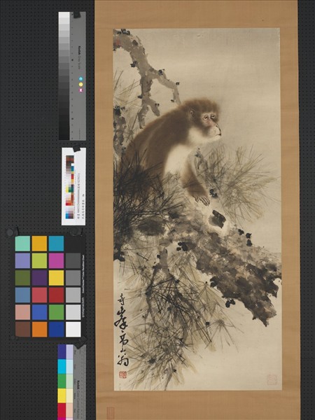 高奇峰(一八八九-一九三三),廣東省番禺(今廣州)人。早歲隨其兄劍父習畫,畫風受兄長及居巢(?-一八九九)、居廉(一八二八-一九○四)風格影響。留日期間,自中西畫學擷取所長,形成了自己的藝術風格。棲息於松樹上猿猴,以設色水墨渲染而成,透過光源及亮彩的表現,色調作深淺的變化,形像生動。署於畫幅左下方之款識,結字奇特,具有個人風格。本幅為林宗毅先生捐贈。
