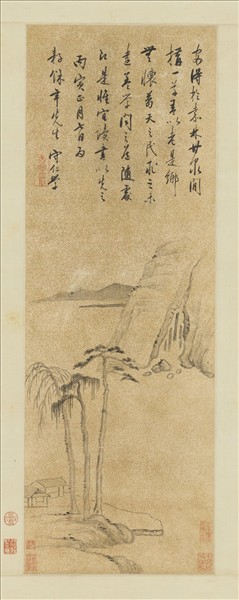 王守仁(1472-1528)字伯安,浙江餘姚人。明代大學者,創立知行合一的「陽明學說」,對後世影響甚深。由於其事功偉大,書畫成就卻少有人知。 本幅繪一河兩岸,遠岸巨岩在望,中空處有幾道小水瀑,近岸則是三樹兩屋,空寂而無一人。這種寧靜的天地,從構圖和呈現的意境,很明顯的受到元代畫家倪瓚的影響。畫上款題,也直接的呼應出作者的希望。七行行草書題款,寫得自由在自在,書法的風格則是集王羲之字的〈聖教序〉為主,瘦勁而具骨氣。 張學良先生捐贈於民國88年。(20110204)