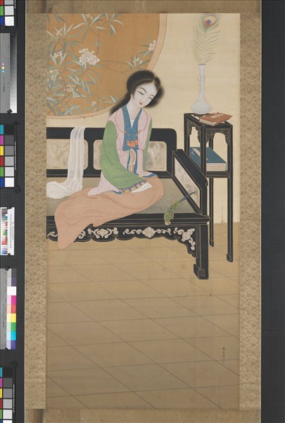 鄭褧裳(西元一八八三-一九五九年)名錦,廣東香山人。他早年留學日本習畫,作品曾經入選東京帝展。後來返國從事藝術教育工作,受命籌設北京美專,並且擔任校長,也曾在故宮博物院前身的古物陳列所中任職,得以有機會可以觀賞古代的繪畫名蹟。中日戰爭期間移居澳門,並在當地終老。戰火烽起之前,他曾響應晏陽初的平民教育運動,深入鄉村民間,參與縣政建設,是位入世的畫家。 他擅長於畫人物,融合中國與日本的繪畫技法,尤其精於古裝仕女,秀逸雅致。畫作的尺寸通常都很大。 這幅畫是畫家在京都習畫時的畢業力作。畫裡所描繪的主角是一位年輕的古裝女子,她蜷曲雙腿坐在以奇石和螺鈿裝飾的榻椅上,低頭凝神觀看綠鸚鵡。(圖一)鸚鵡因為能模仿人說話,常被視為通靈之鳥,在傳統的仕女畫中,是常出現的女性良伴。而其輕巧的體態,更襯托出女子的嫻靜溫雅。華麗的家具、和瓶中所插的孔雀翎毛,都傳達出富貴的氣息,但架上擺置的書籍,為這閨房增添了幾分風雅。(圖二)圓窗外則是繁花盛開的麗景。(圖三) 畫中對景物質感與細節的描繪精巧。像椅子上各面都有不同的裝飾,隨意置放的白紗也刻意要畫出薄如蟬翼的透明感。(圖四)從家具與地磚的布列方向看來,畫家顯然經過西洋透視法的訓練。但畫中濃厚的裝飾意趣,及女子頭髮蓬鬆如雲的畫法,(圖五)則和日本繪畫的技法關係更為密切。 本幅是由鄭美成女士捐贈。