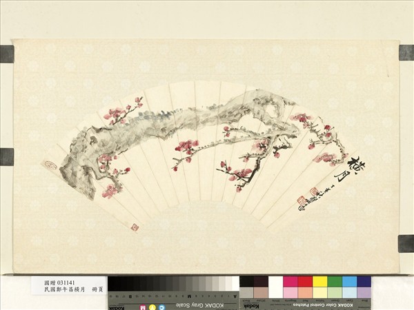鄭午昌(西元一八九四-一九五二年),名昶,號弱龕。浙江嵊縣人。曾任教上海美專及新華藝專。一九二九年組織蜜峰畫社。工書善詩文,繪畫山水、花卉、仕女,都很專長,又能篆刻。在繪畫史與理論方面也有專著傳世。此幅扇面作於民國三十六年(一九四七),畫古幹紅梅,自左至右,橫踞畫幅上端,枝椏折返,綴以幾朵盛開的紅梅,十分醒目。本冊為林宗毅林誠先生捐贈。