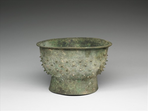 侈口,折沿,直壁深腹,高圈足外撇。口沿及圈足飾夔龍紋,器腹飾斜方格乳丁紋。