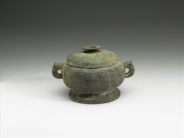 子母口、環耳、圓腹、圈足、附鈕蓋,耳作獸首形。腹部飾變形蟠螭紋。