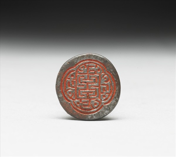 銅章。印面圓形。印面鑄圖案化陰文,外加四瓣花形框。鈕作長柱形,其上飾蓮瓣紋、卷草紋等,中間穿一孔,應用來穿繩繫掛。此印為譚延闓的簽押印,譚延闓在清末民初時活躍於政壇。