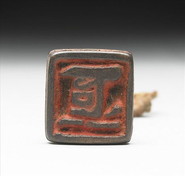 銅章。扁長方體,印面正方。印面鑿刻圖案化陽文,此印為譚延闓的簽押印,押文圖案化難以辨認,仿效起來更加困難。鈕作扁長方形,上方中間鑿一孔並穿有繩。