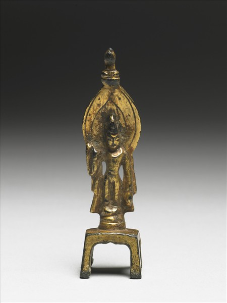 鎏金菩薩立像,身體微微擺動,具動感,頭上飾頭光,右手上揚持楊柳,左手下垂持淨瓶,可能是觀音造像。帶座,座形如几。
