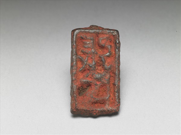 鐵質印,呈黃褐色,長方形,繩紐,印為「張氏」二字陽文篆款,外圍一方框。