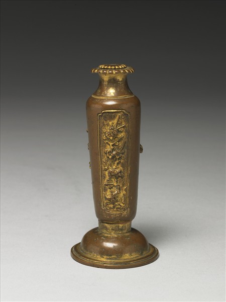 赤黃色銅瓶,雙層菊花瓣式口,束頸,斜肩、長直腹下斂,底接一覆鐘式座。頸飾一道弦紋,腹部有三開光,各飾以松、梅與鳥禽。