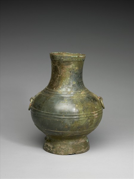 盤口、長頸、斜肩、鼓腹、高圈足,器肩兩側有獸首銜環。腹部有三道凸棱。附木座。