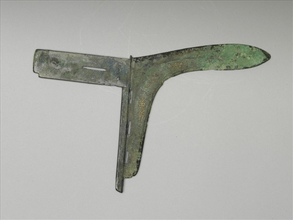 戈,單面刃,胡部有四穿,內部有一長方形孔。援部至胡部有銘文三字。