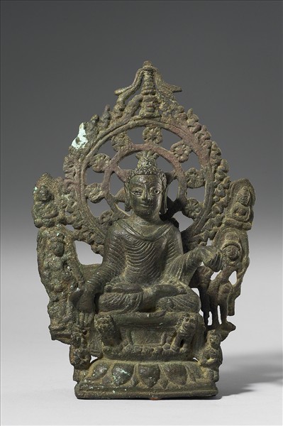 巴基斯坦地區作品,背光疑非原件所有。一佛於獅子座上結跏趺坐,座下尚有一蓮臺。佛右手施與願印,左手握衣角,身著通肩式僧衣。獅子座側,二供養人屈膝而脆,雙手合什,以示禮敬。佛像的背光由一邊飾火焰紋的大形圓光和二菩薩像組成,二菩薩腰擺臂移,作三折扭姿,頭頂各有一化佛,圓光頂部尚有頂繫飄帶的舍利塔。與贈銅000050相較,此像之寫實性減弱,作者以規律化的弧線表示領口衣褶,手肘處的衣紋雖起伏有致,重韻律性的變化,但和肘部關節的動作毫無關係,胸部平坦,贈銅000050中所見胸肌的圓鼓和彈性,在此已無迹可尋。這些都足以說明,斯瓦特造像的發展已由寫實逐漸邁向形式化。