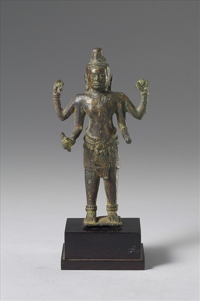 青銅鎏金菩薩立像,柬埔寨一帶作品,約十二至十三世紀,此時期柬埔寨與泰國之佛教造像藝術風格受吉蔑文化之影響,佛教信仰帶有印度教與密教風格,例如觀音菩薩眾多的變化形象之一的四臂觀音形象,即受到印度教神祇多臂及持物等圖像特徵。此外,造像之面相與體態脫離印度原型,轉化為柬埔寨人種特色,此像即為一例。此菩薩像頭頂高髻,頭上有一坐佛,應為西方極樂世界教主阿彌陀佛,是觀音菩薩像特徵之一;菩薩上身全坦,不佩瓔珞,腰部縛帶尾端呈魚尾狀,下身著裙裳,衣紋作垂直平行直線,造型十分刻板,胸肌厚實,腿部肌肉結構處理手法簡略,是此時期柬埔寨地區作品之特色。雕像身體右側主臂持蓮花苞,右另一臂執念珠,左側主臂似呈持物姿勢,但手腕斷缺;左另一臂似持物但左腕已殘缺。