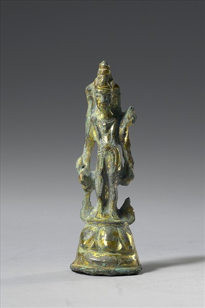 此像頭戴三葉冠,冠帶垂落,肩披天衣,頸掛項圈,瓔珞相繫於腹前,左手上揚,右手下垂,皆有持物。然而,由於破損嚴重,且表面生銅綠,因此持物不明。此像左腳在前,右腳在後,腹、臀隨此一站姿而扭向其左,使其姿態頗具動感,乃唐代菩薩造像的特色。然而,頭部較大,上、下身比例接近為一比一,又頗似隋代風格,故推測此像為唐代初年的作品。