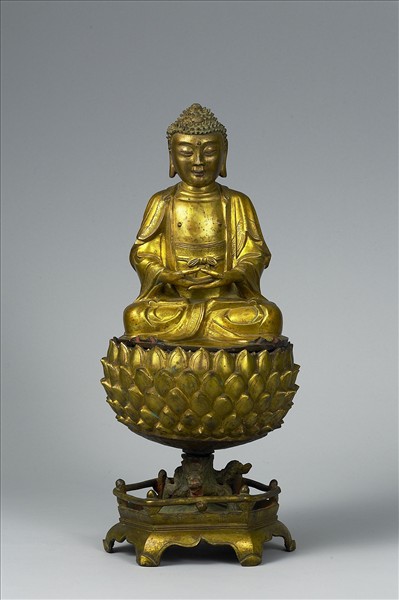 此像面頰豐腴,眉眼細長,表情慈祥。內著長裙,腰繫腰帶,外罩僧衣,前胸裸露,有一卍的刻痕,為佛三十二相好之一。雙手結定印,雙足結跏趺坐於蓮花座上,蓮座由三龍頂戴。整體而言,頭部比例較大,胸部雖略有起伏以呈現肌膚彈性,但手指和腳掌扁平,衣紋走向亦趨格式化,配上寬正的肩膀,顯得幾何味十足,或為晚明之作。又,布料邊緣有陰刻紋飾帶,與藏式造像的裝飾手法有關,反映自元以來藏傳佛教對中國的影響。