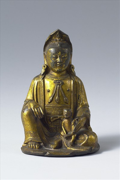 此菩薩頭戴寶冠,中有一化佛,外披頭巾,衣袍曳地,成其底坐,採右腳立地,左腳曲折平放的遊戲坐姿,左手扶著一童子,乃宋代以來流行的送子觀音的圖像表現。《妙法蓮華經》載:「若有女人,設欲求男,禮拜供養觀世音菩薩,便生福德智慧之男;設欲求女,便生端正有相之女」,送子觀音的信仰即由此而來。菩薩面頰飽滿,五官集中,眼呈俯視,表情詳和。又,頭部比例大,裸露的胸部平板,手、腳指方扁,有如鋼琴上的鍵盤,幾何味十足。再者,頸掛繁複纓絡,頭巾、衣服沿邊陰刻花紋飾帶,呈現了藏式造像的裝飾手法。種種特色與晚明的佛教造像頗為相近,或為當時之作。