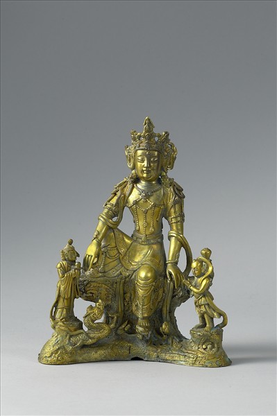 此群像正中為坐於山岩的觀音菩薩,其左為合掌而拜的善才童子,其右為捧珠供養的龍女,分別表現了《大方廣佛法華經》、《妙法蓮華經》所載善才童子和龍女修菩薩行成佛的事蹟。又,觀音菩薩的左側置有一淨瓶,右側有一鸚鵡,顯示了菩薩傳播佛法、教化信眾的特質。如此複雜的圖像表現,反映的是宋代以來菩薩信仰深入中國民間,並逐漸擺脫造像儀軌的發展。另外,菩薩頭戴繁複的三葉寶冠,胸前瓔珞呈縵網式垂落,披帛纏捲於手臂,寬胸細腰的體格,近似於明永樂、宣德兩朝宮廷內的藏式菩薩造像,但上半身直挺而立,與永、宣二朝造像藉胸腹肌肉扭轉表現體態韻律不同,或為晚明之作。