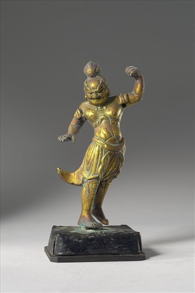 銅鎏金天王立像。由於天王在佛教中,往往有著護持正法、保護眾生的責任,所以在造像或繪畫上,常以武裝或威猛的形象,來表達天王抵禦侵擾的能力與神力,這一尊天王立像的製作,便同時採取了這兩種方式。此外,胸前的護甲,便連結了武者的裝扮;豎眉憤怒的容貌,手部與腰腹各處糾結精實的肌肉,以及曲臂上揚、彷彿隨時可以揮擊的左手,都表達這是一尊具有力量威勢的造型。