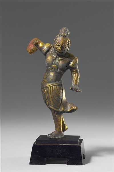 造像者透過天王豎眉睜眼的憤怒形象,彎身扭腰、握拳作勢下揮的左手,以及手臂、腹部、背部線條分明的肌肉,來表現天王威猛剛強的形象,傳達護衛佛法與眾生的力量。腰下的軟裙,彷彿因身驅的動勢而緊貼於大腿正面,而揚起飄動的裙尾,正呼應身體扭轉蓄力的動勢。