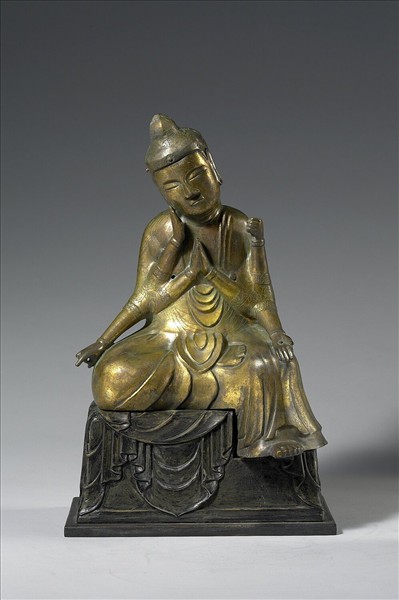 銅鎏金如意輪觀音菩薩。頭右側,呈坐姿。共有三雙手。或合掌於胸前,或支頤呈思維像,或置左膝作與願印。較之於身體的比例,手臂顯然過小而稍顯拘迫,但也因為如此,很容易讓人將目光集中在支頤側首的表情上,感受到菩薩閉目沈思的氣氛。附木座,木座表面刻衣紋,與菩薩衣紋相呼應。